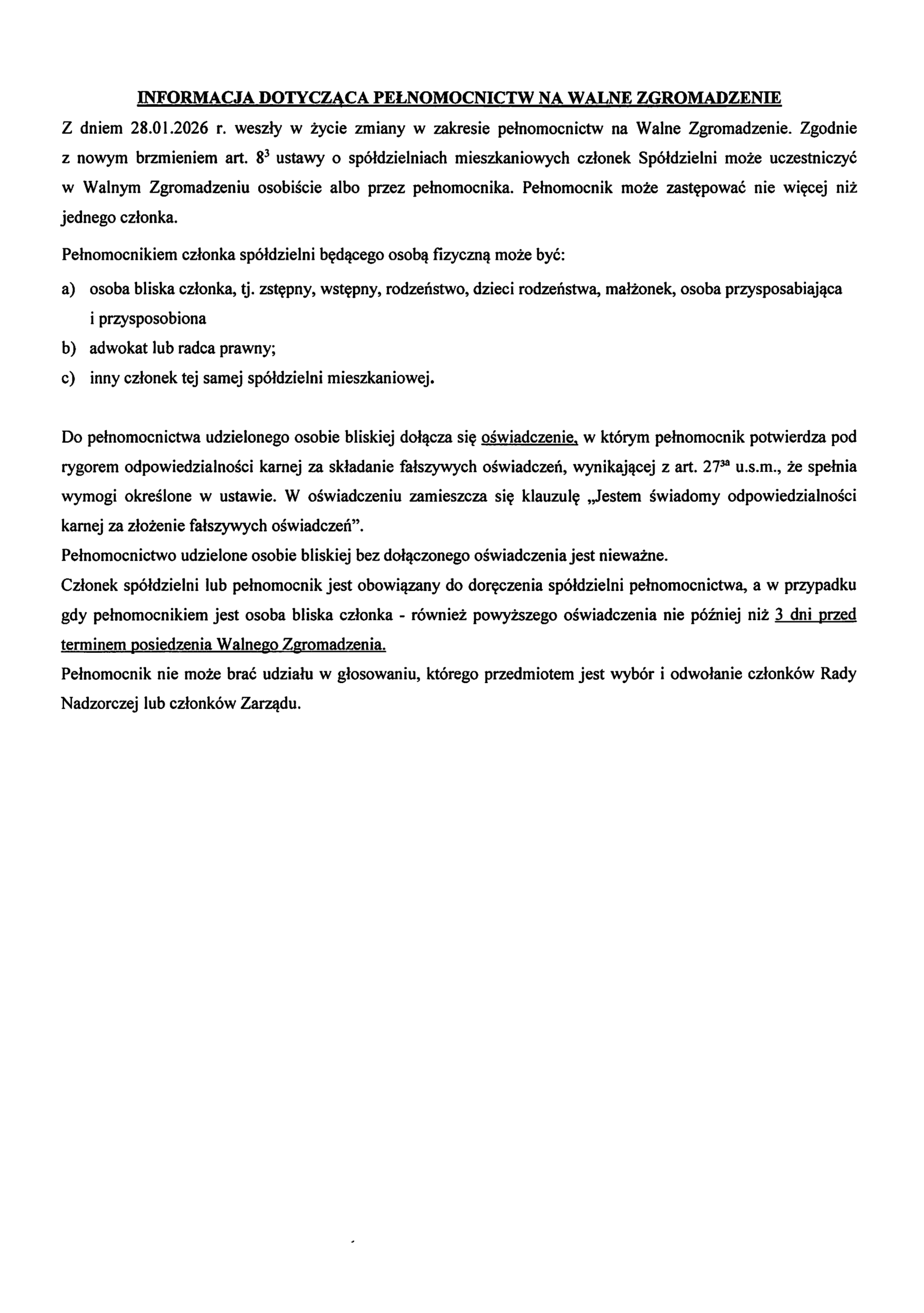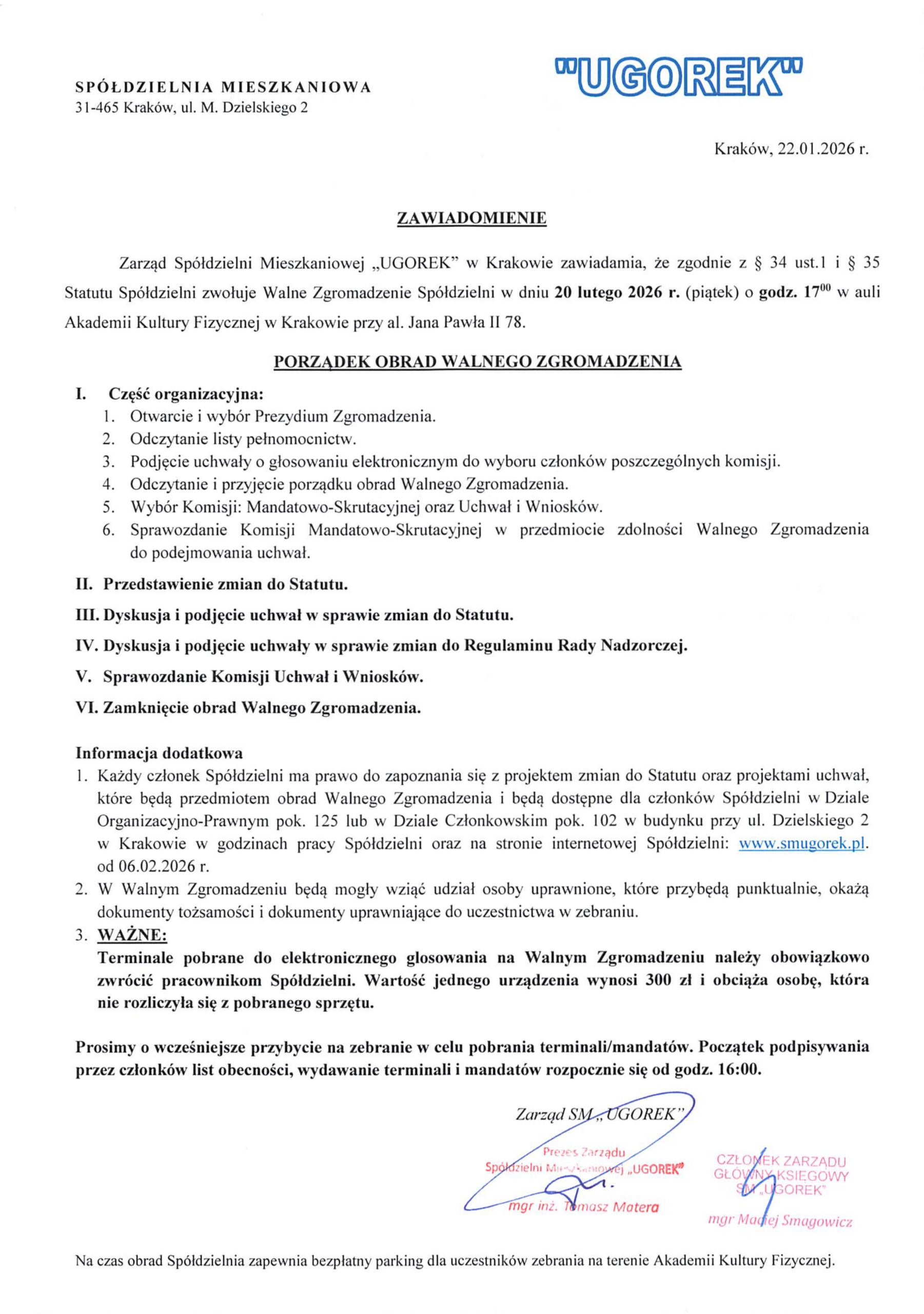 Zawiadomienie o Walnym Zgromadzeniu Spółdzielni Mieszkaniowej „UGOREK” w Krakowie Opublikowano 2026-01-30